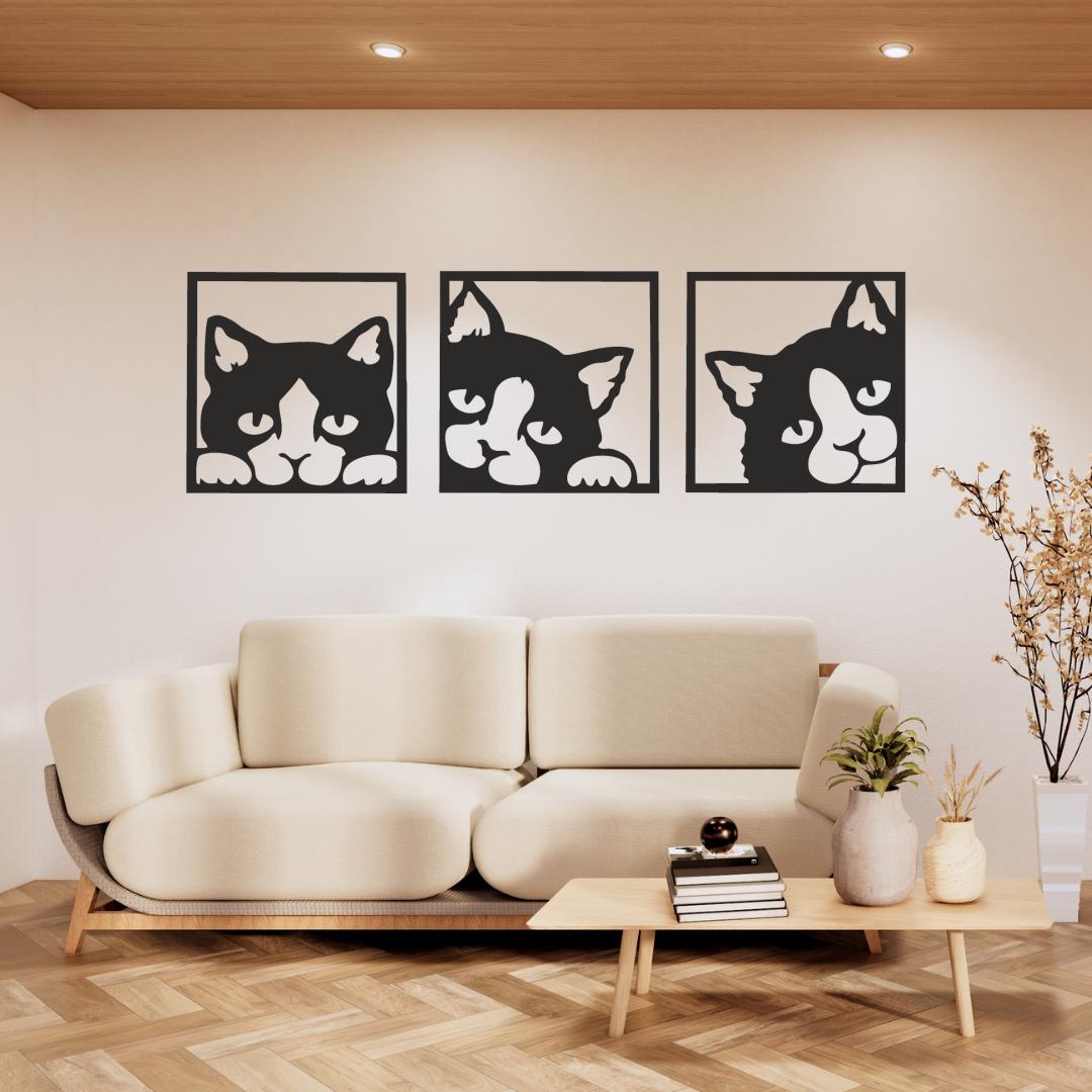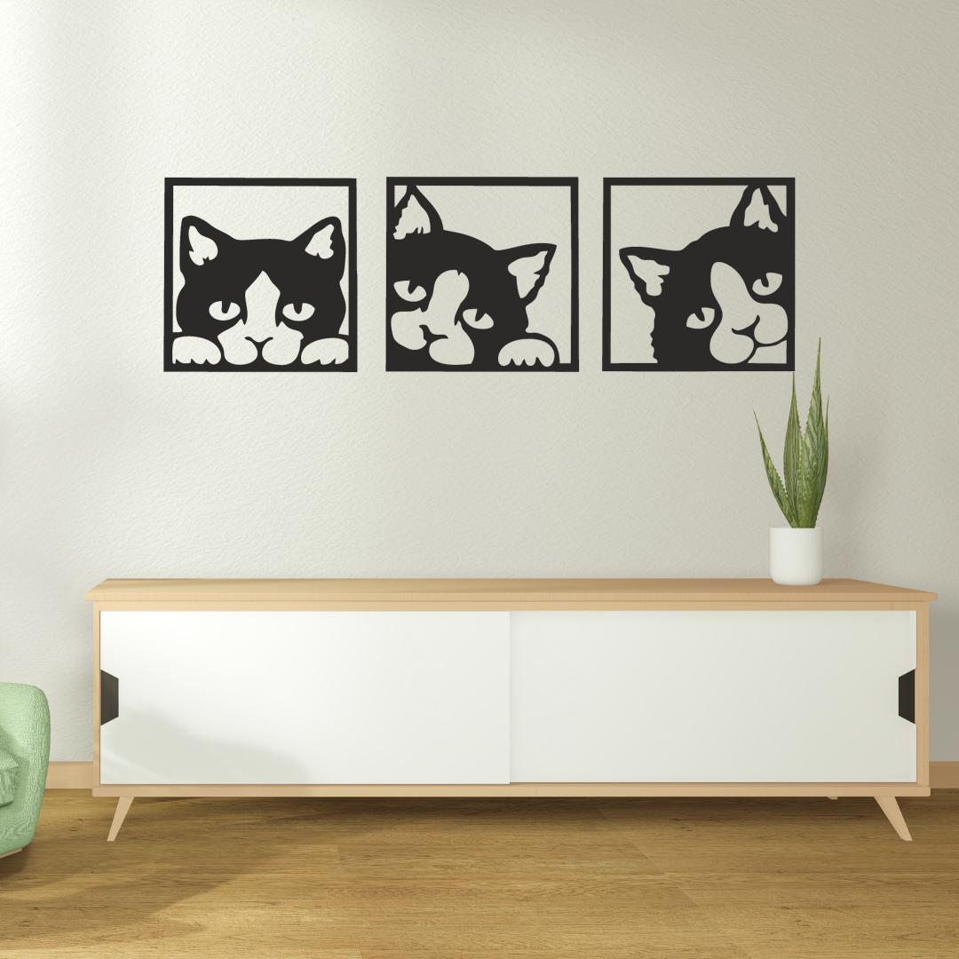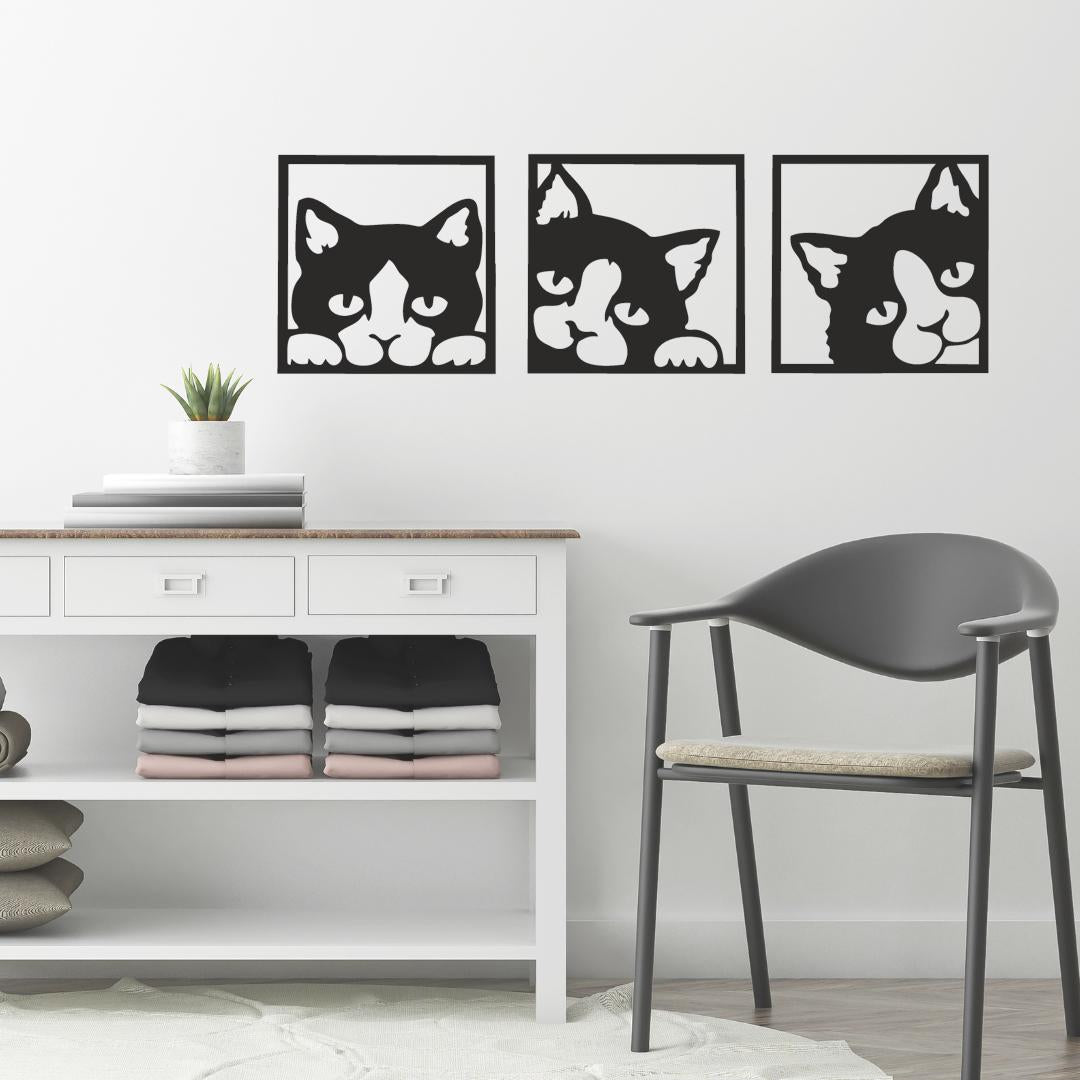 Designed for cat lovers, this stylish wall panel features three curious kittens peeking through faux frames — a fun and artistic expression of feline personality. Laser-cut from 3mm gloss acrylic in your choice of black or white, this piece is modern, durable, and lightweight.