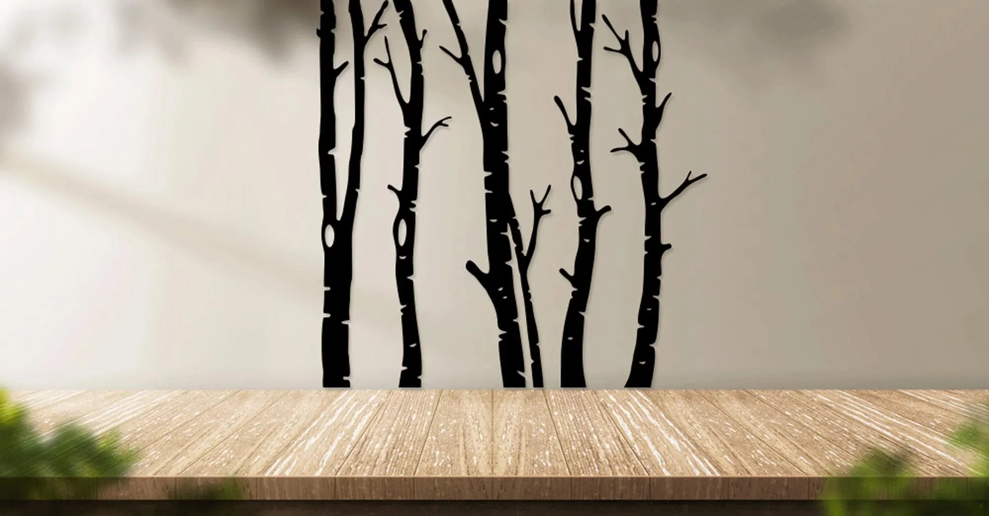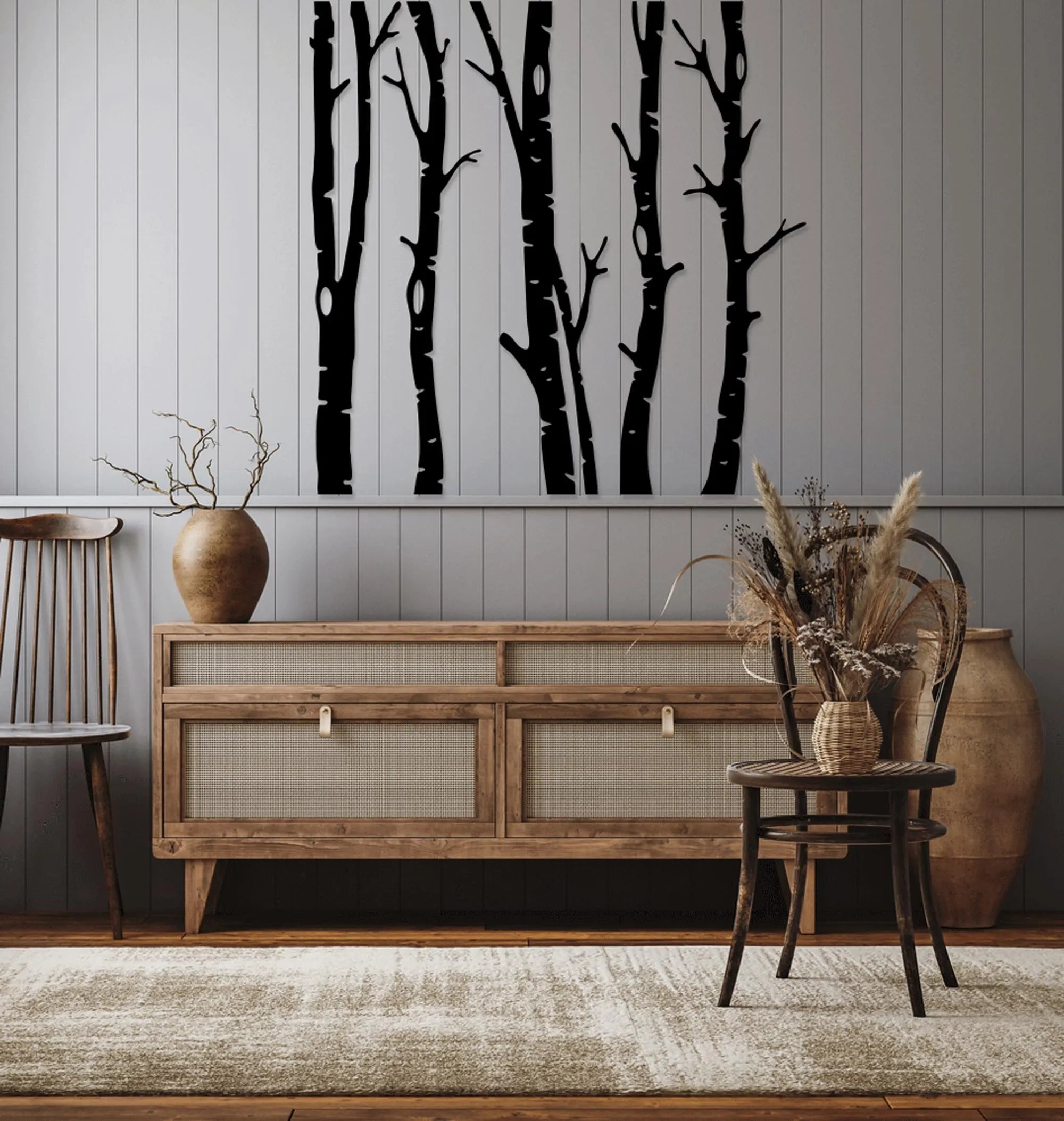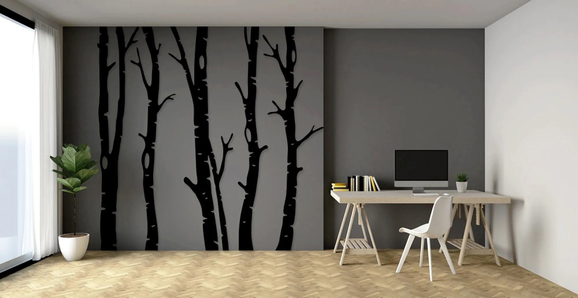 Design: Five vertical tree branch silhouettes with detailed bark textures, arranged side by side for a cohesive forest effect