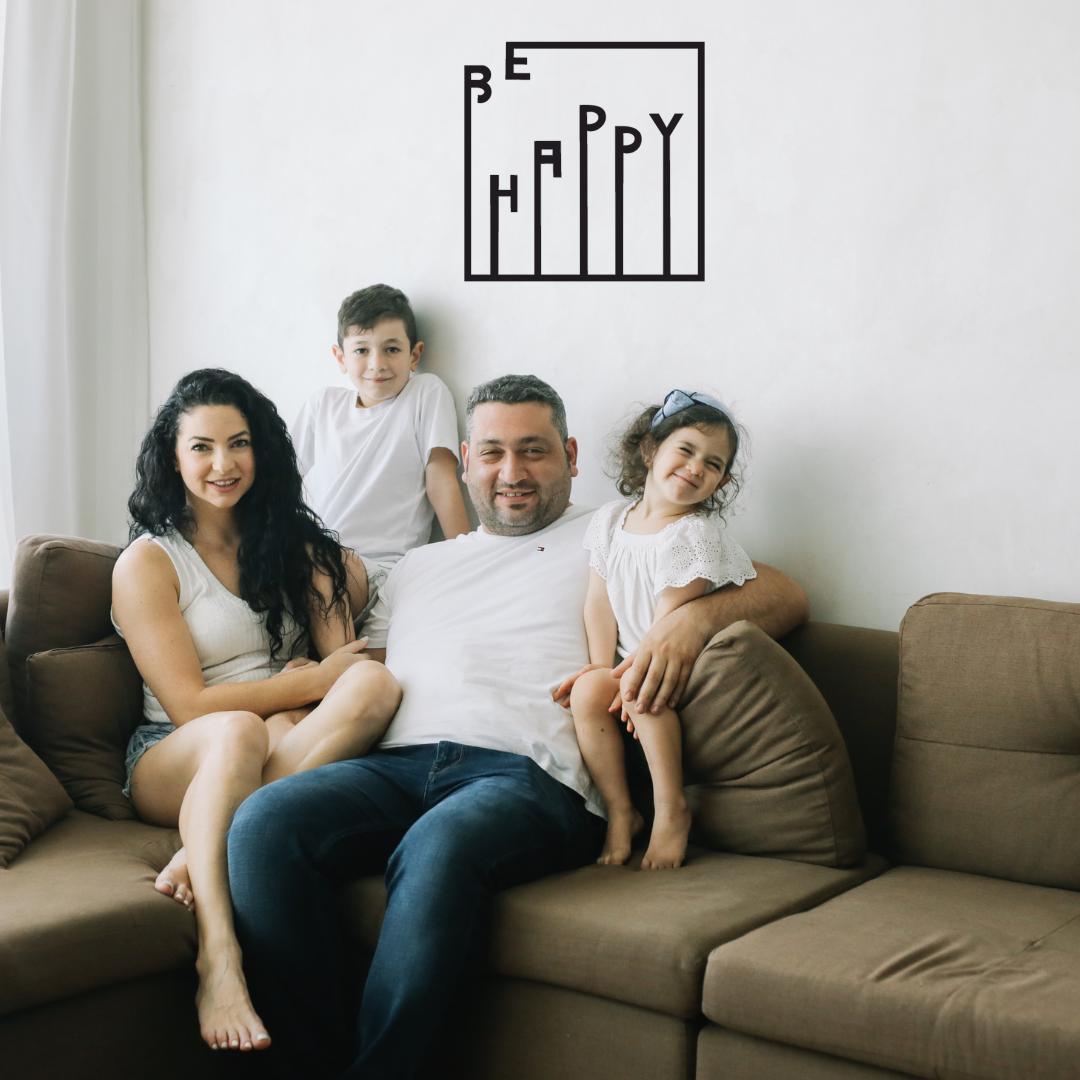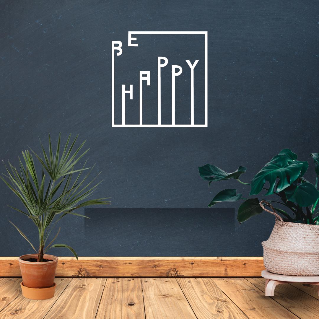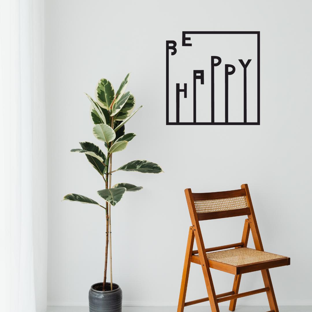 Design: Clean rectangular frame with tall vertical letterforms spelling “Be Happy” for a contemporary, minimalist look