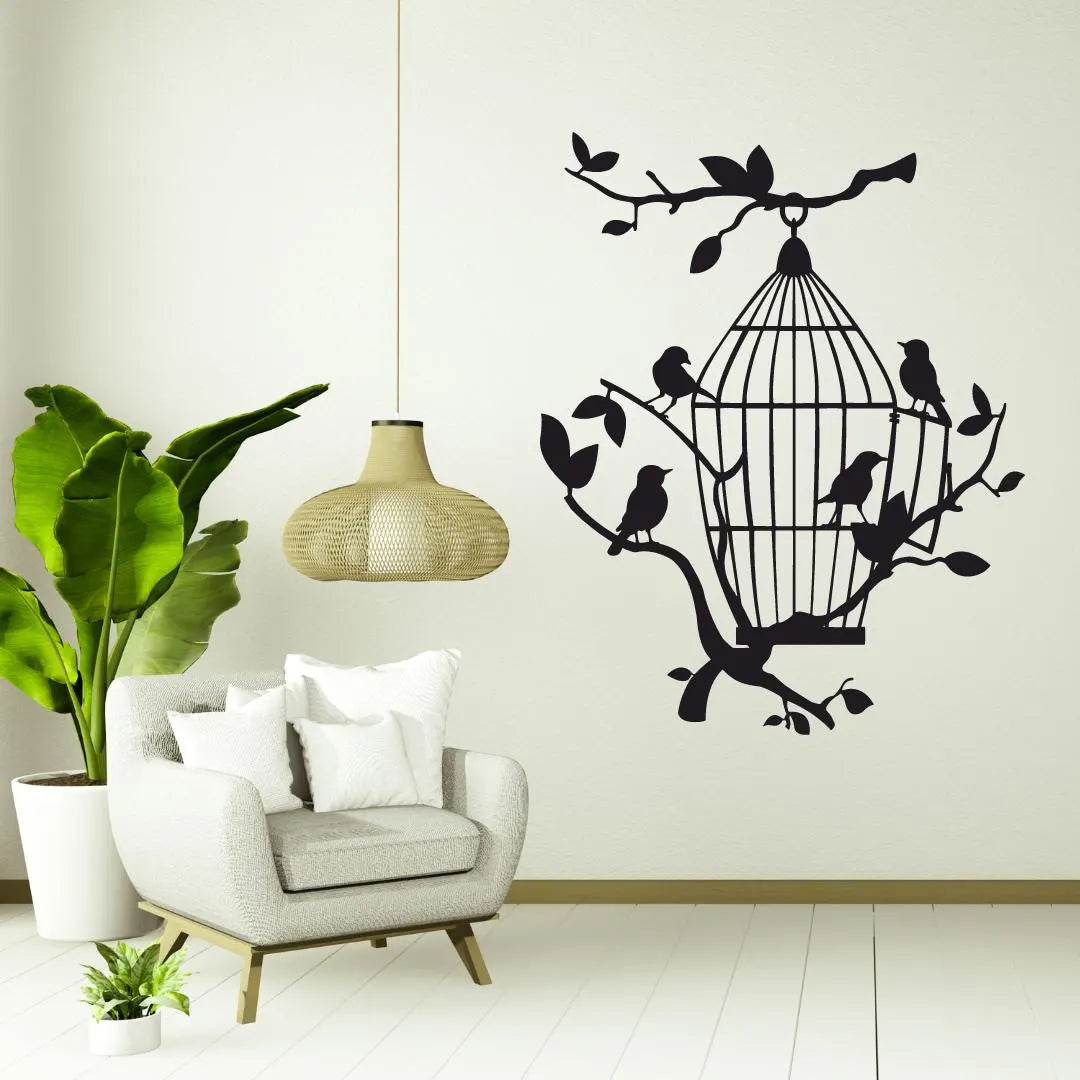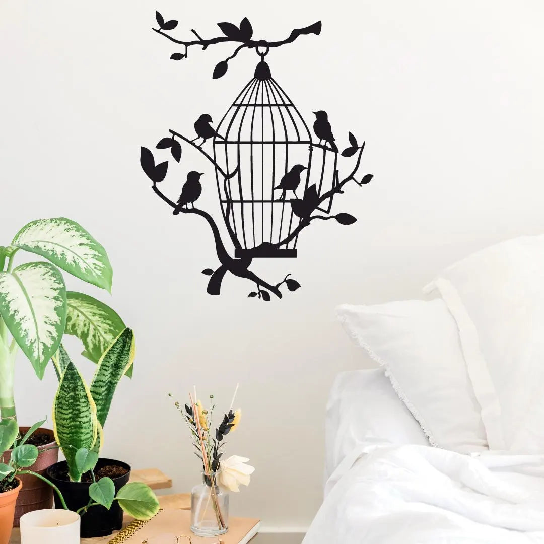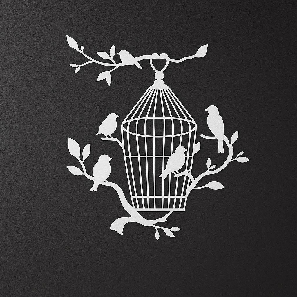 Bring a peaceful and timeless aesthetic into your home with this beautifully crafted laser-cut wall hanging, featuring delicate birds perched around a vintage-style cage on leafy branches. Cut from high-quality 3mm gloss acrylic in black or white, this piece suits bedrooms, lounges, entryways, or indoor gardens.