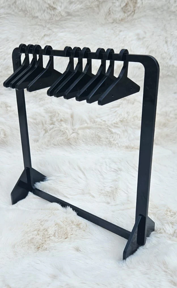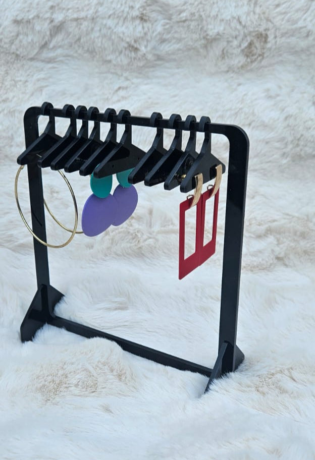 Showcase your favourite earrings with sleek sophistication using our Black Acrylic Earring Stand with 10 Mini Hangers, precision laser-cut from premium 3 mm gloss acrylic. The ten detachable mini hangers neatly display up to 10 pairs of studs or small drop earrings. Its flat-pack, slide-in base assembles in seconds—no tools required—making it perfect for modern vanities, boutique counters, bridal shows, or pop-up markets.