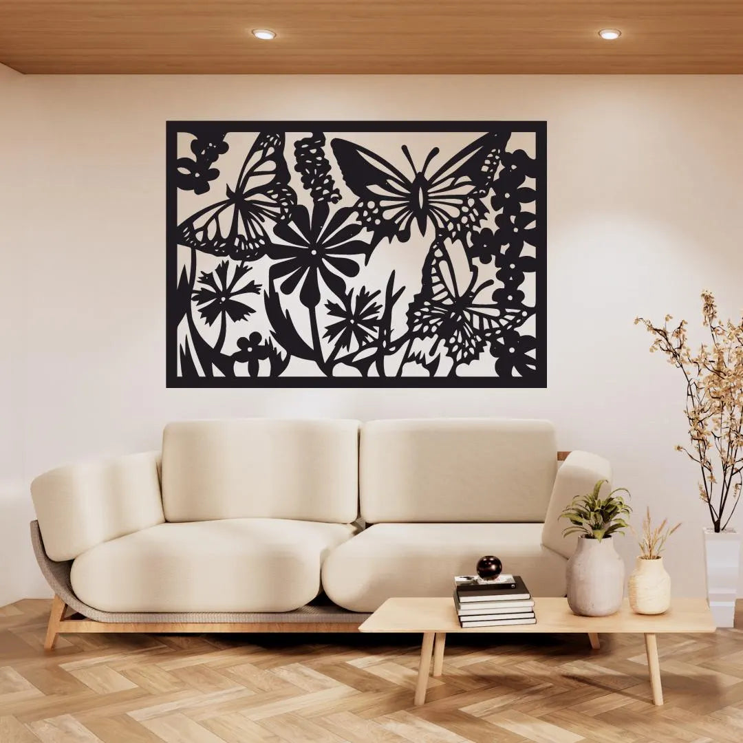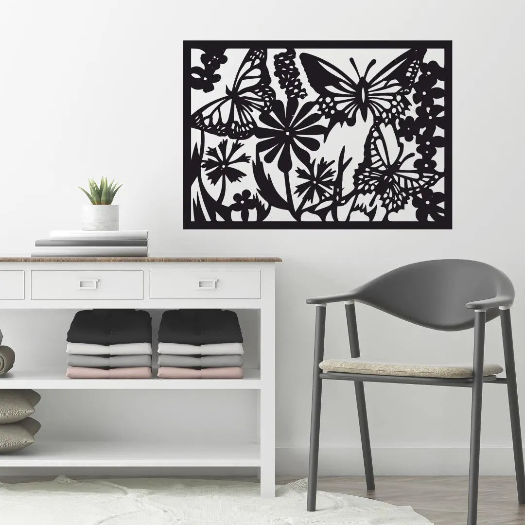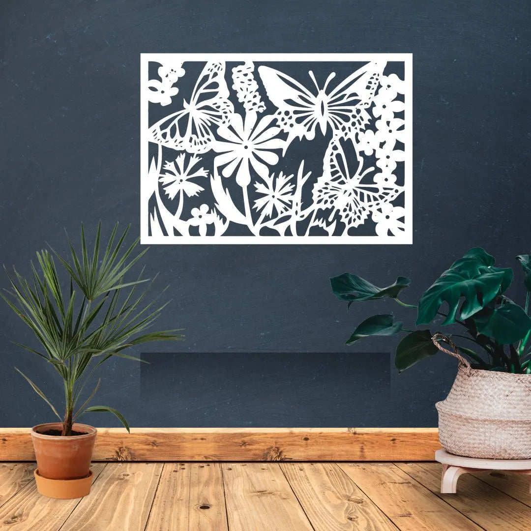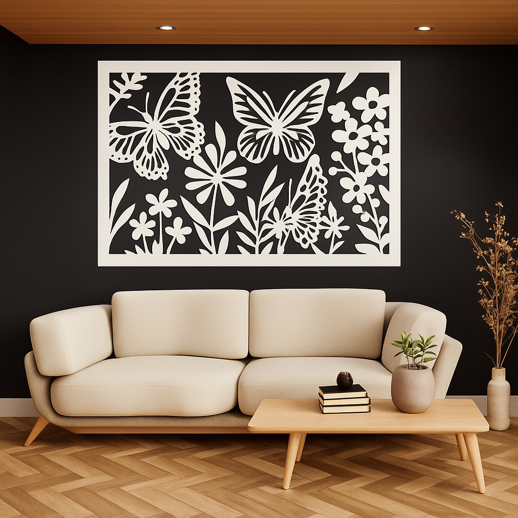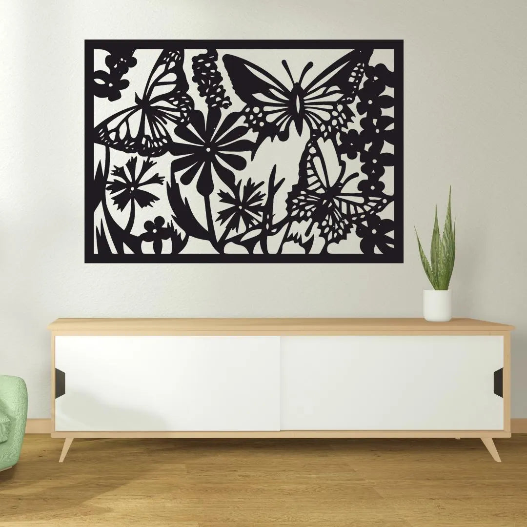 Add elegance and nature to your walls with this beautifully detailed butterfly and flower panel. Crafted from high-quality 3mm gloss acrylic, this design showcases three butterflies fluttering among blooming wildflowers — perfect for living rooms, lounges, or bedrooms.