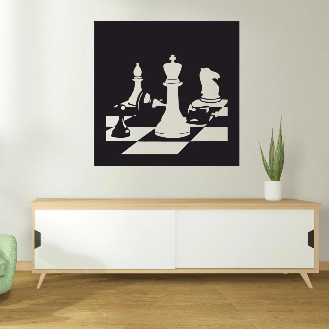 Celebrate strategy, focus, and creativity with this Chess Wall Art, featuring a dramatic snapshot of a chess match in progress. Laser cut from 3mm gloss acrylic, this bold black-and-white piece is perfect for game rooms, lounges, offices, or the homes of chess lovers.