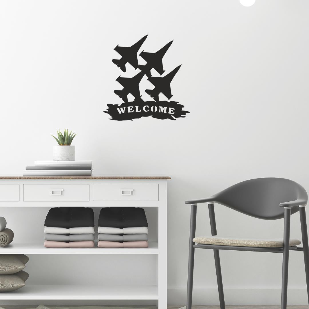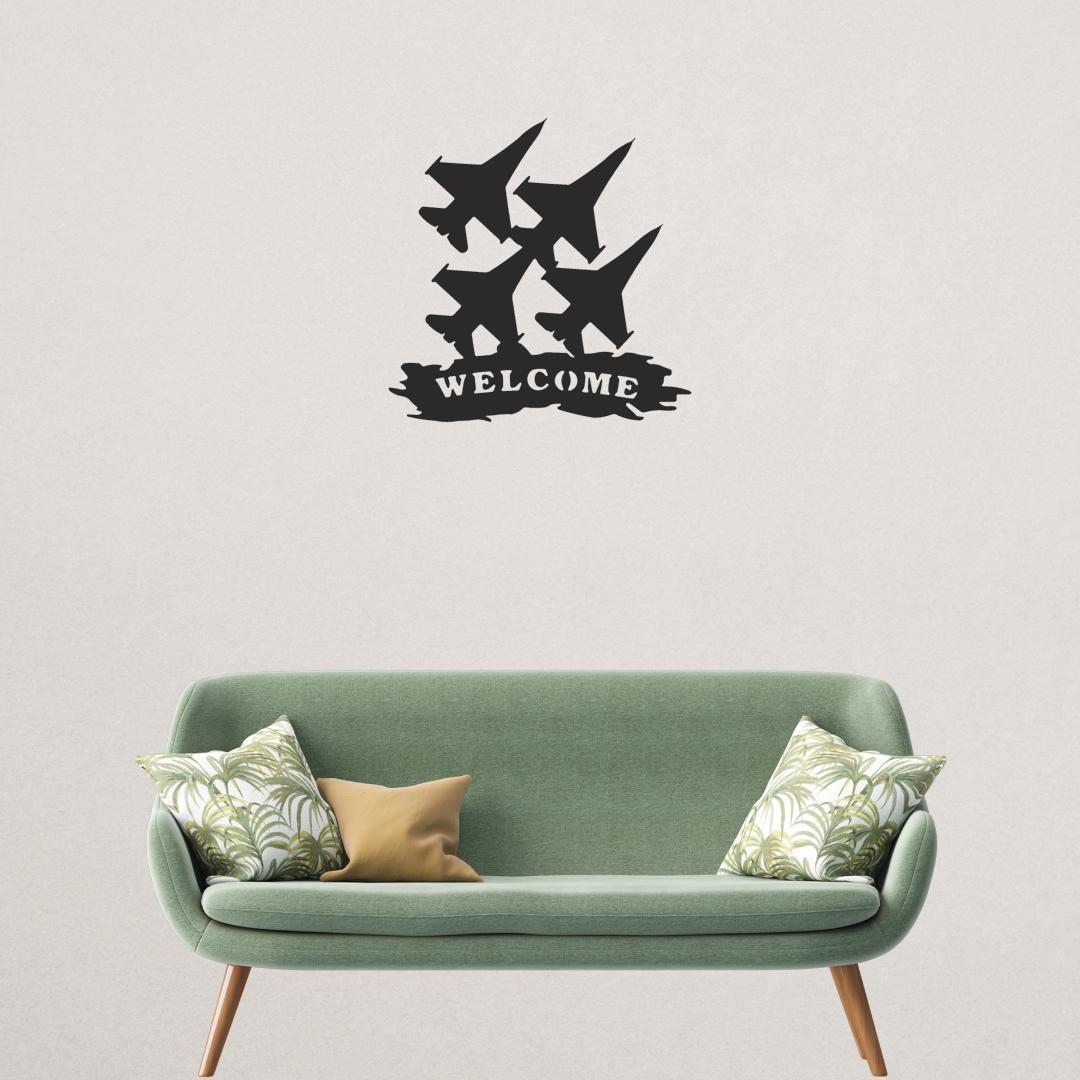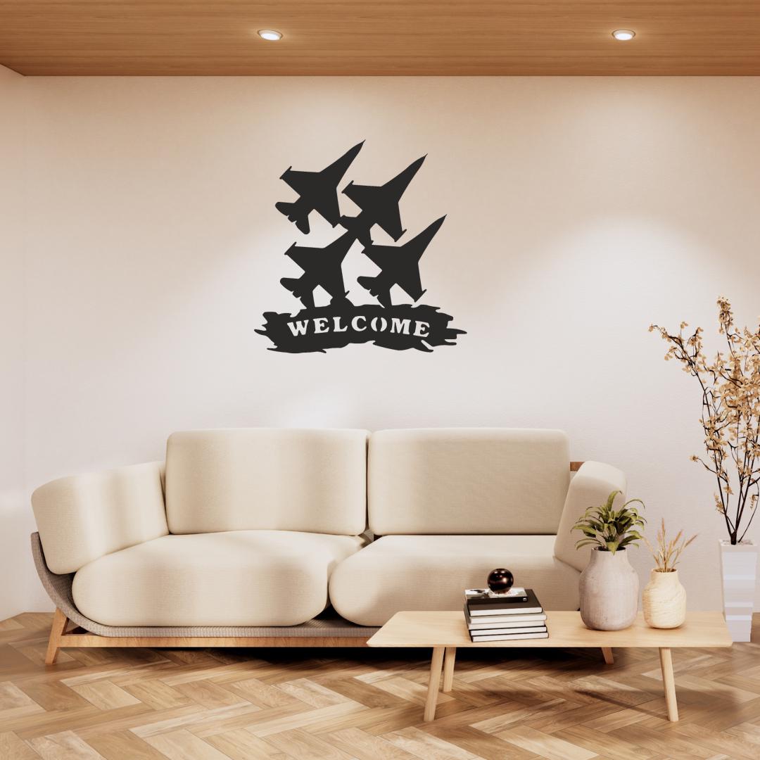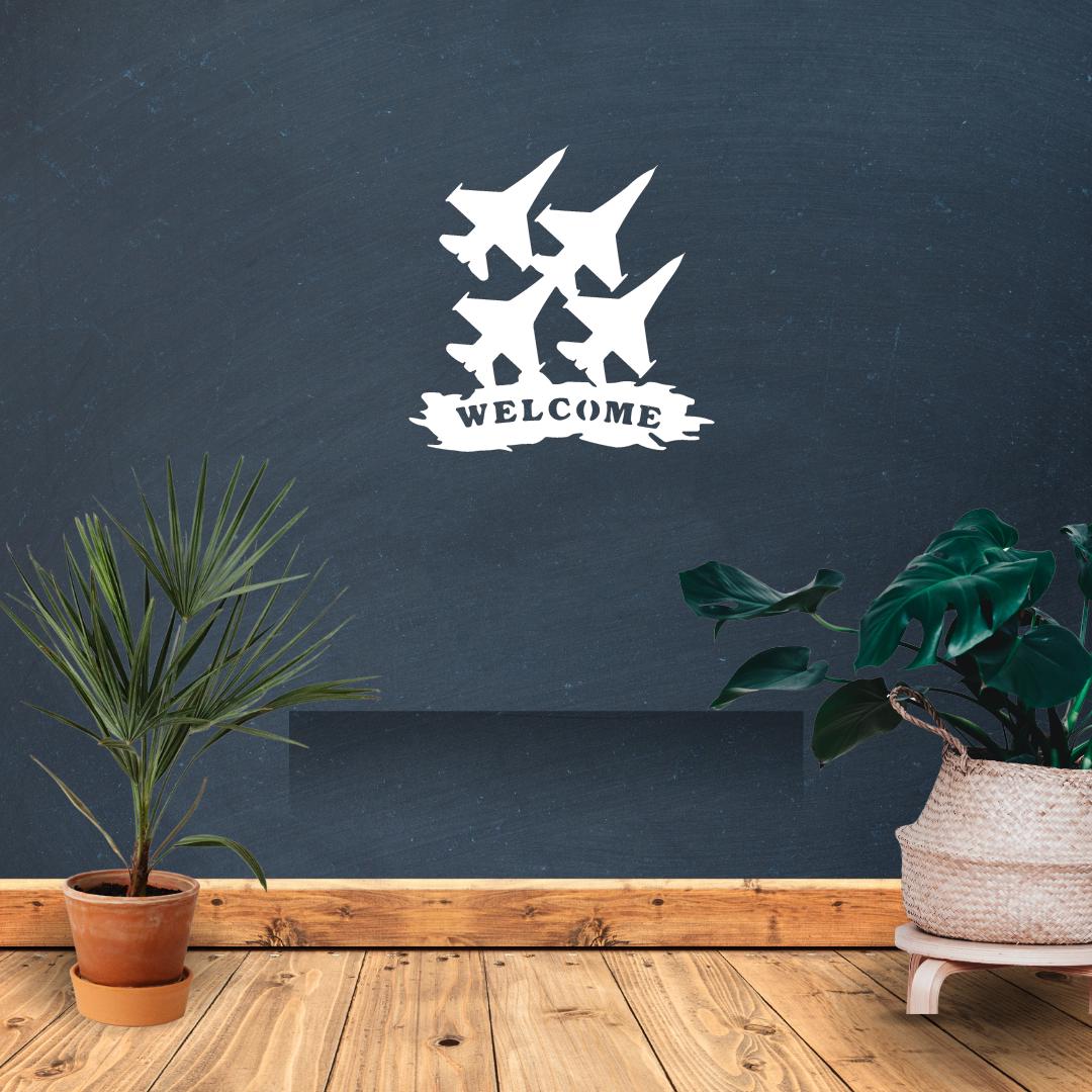 Design: Quartet of F-16 silhouettes flying tight formation atop a stylized “Welcome” scroll—engineered for crisp detail and dramatic impact