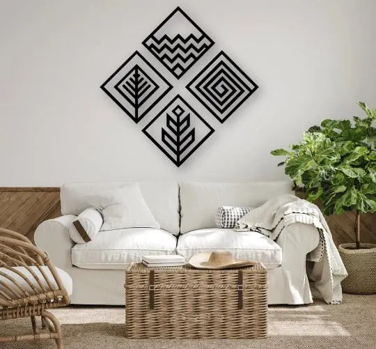 Elevate your interior with Geometric Four-Panel Wall Art Acrylic, a precision laser-cut set of four premium 3 mm gloss acrylic panels. Each identical-sized panel is arranged in a diamond layout, featuring a stylized nature element—waves, spiral, leaf, and branch—rendered in crisp geometric lines. Crafted by Bhavya Phull in New Zealand, this “modern wall art” ensemble brings “contemporary nature décor” flair to living rooms, bedrooms, or offices, uniting organic inspiration with minimalist design.