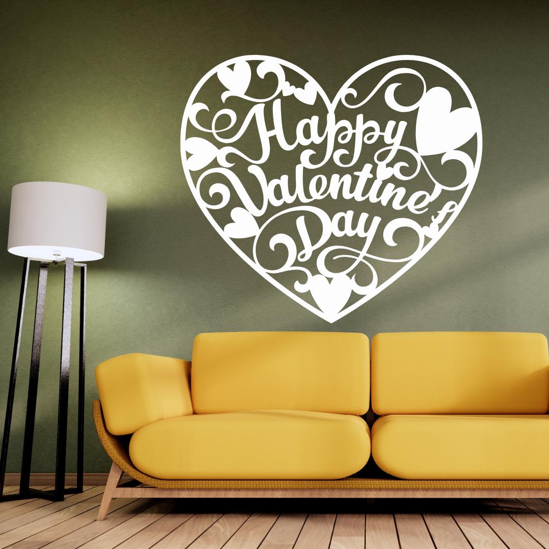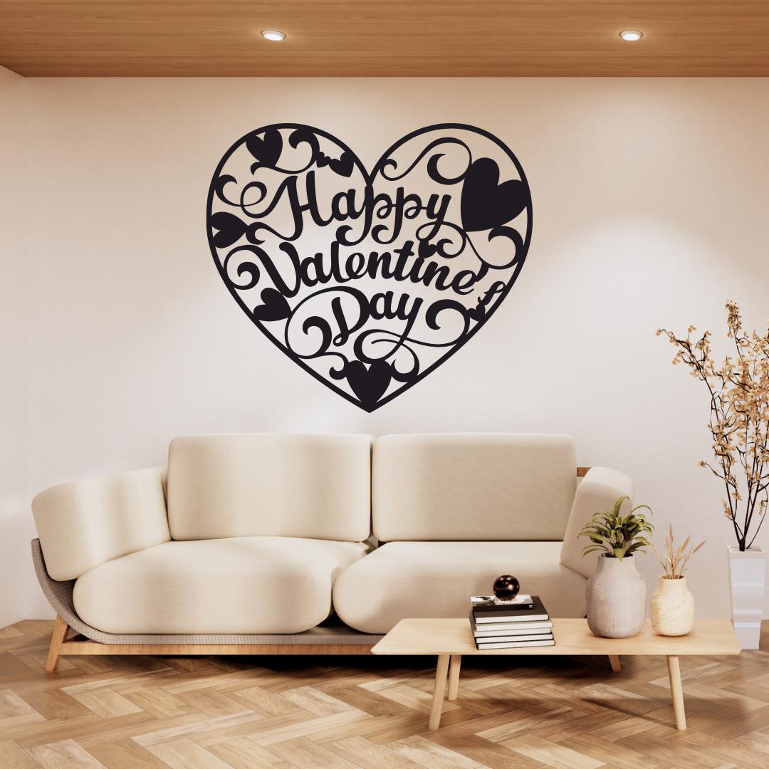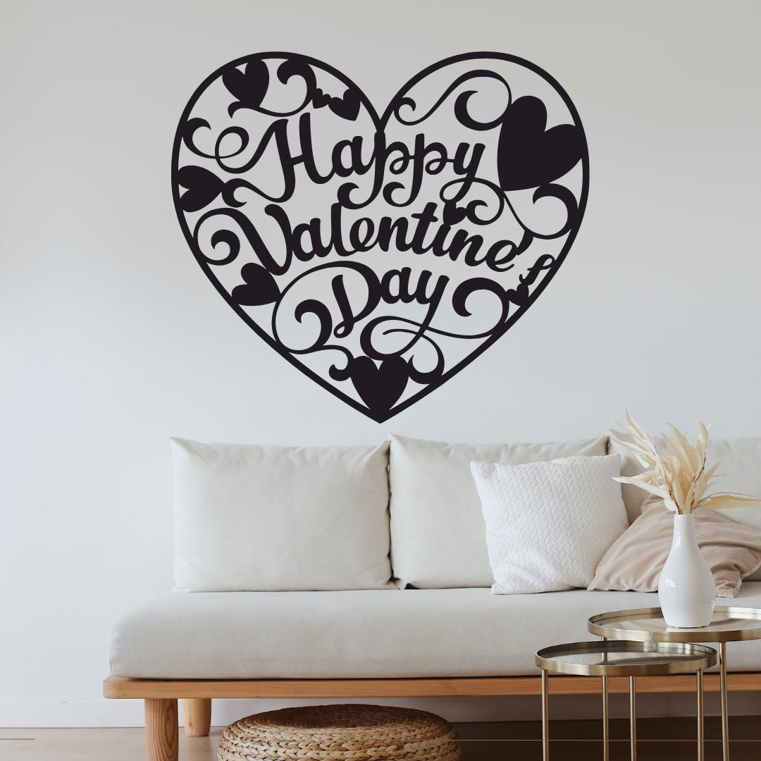Design: Elegant cursive “Happy Valentine’s Day” typography enveloped by ornamental hearts and swirls within a heart outline
