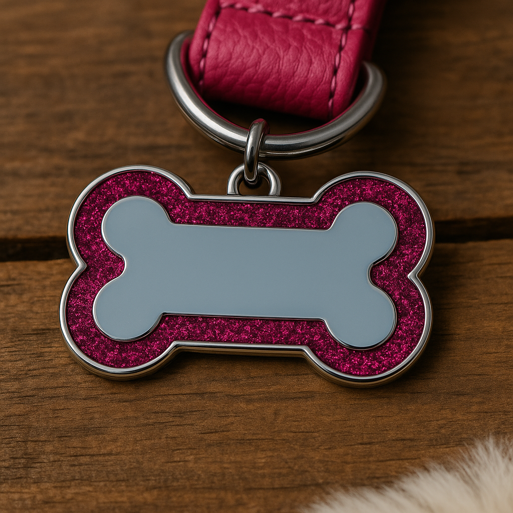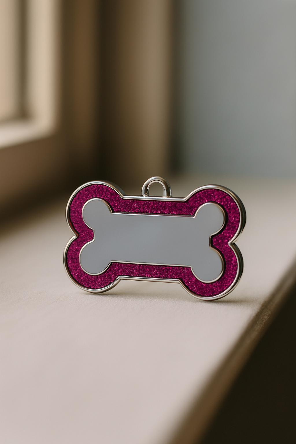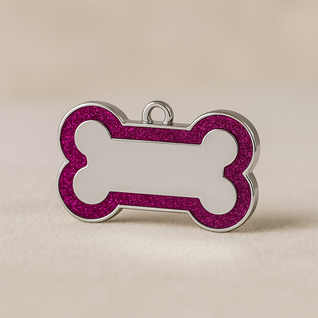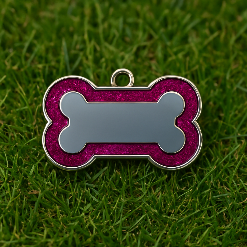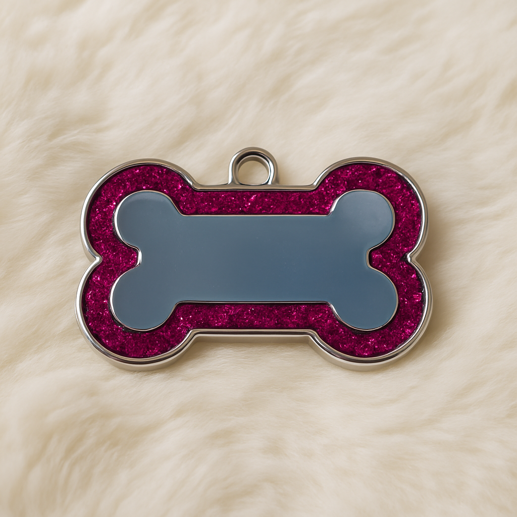 Add sparkle to your pet’s collar with our Hot Pink Glitter Bone Pet Tag, perfect for stylish dogs and cats alike. Designed for both charm and safety, this tag allows personalization with your pet’s name and contact details to keep them secure and identifiable at all times.