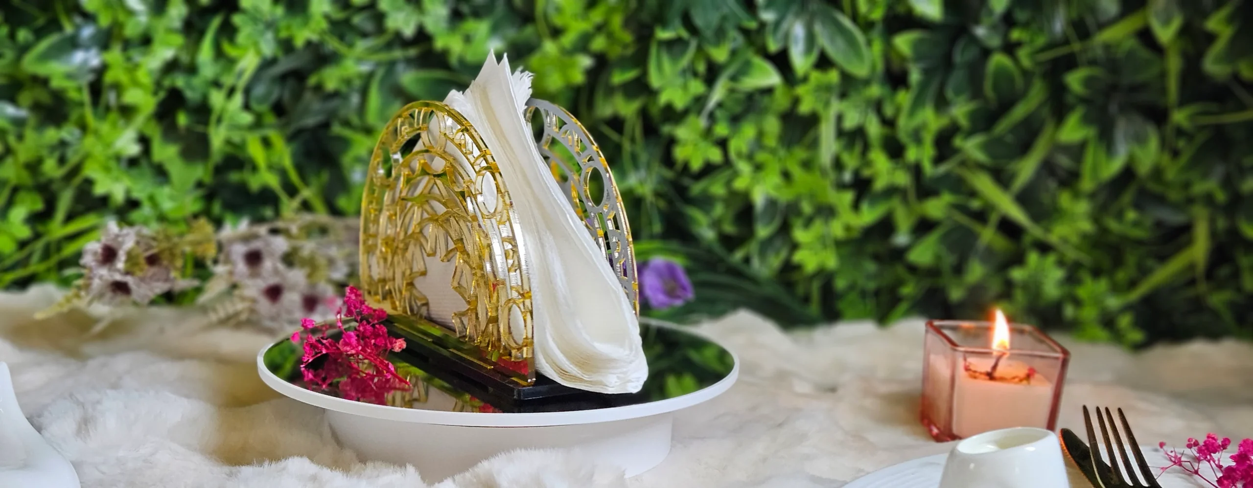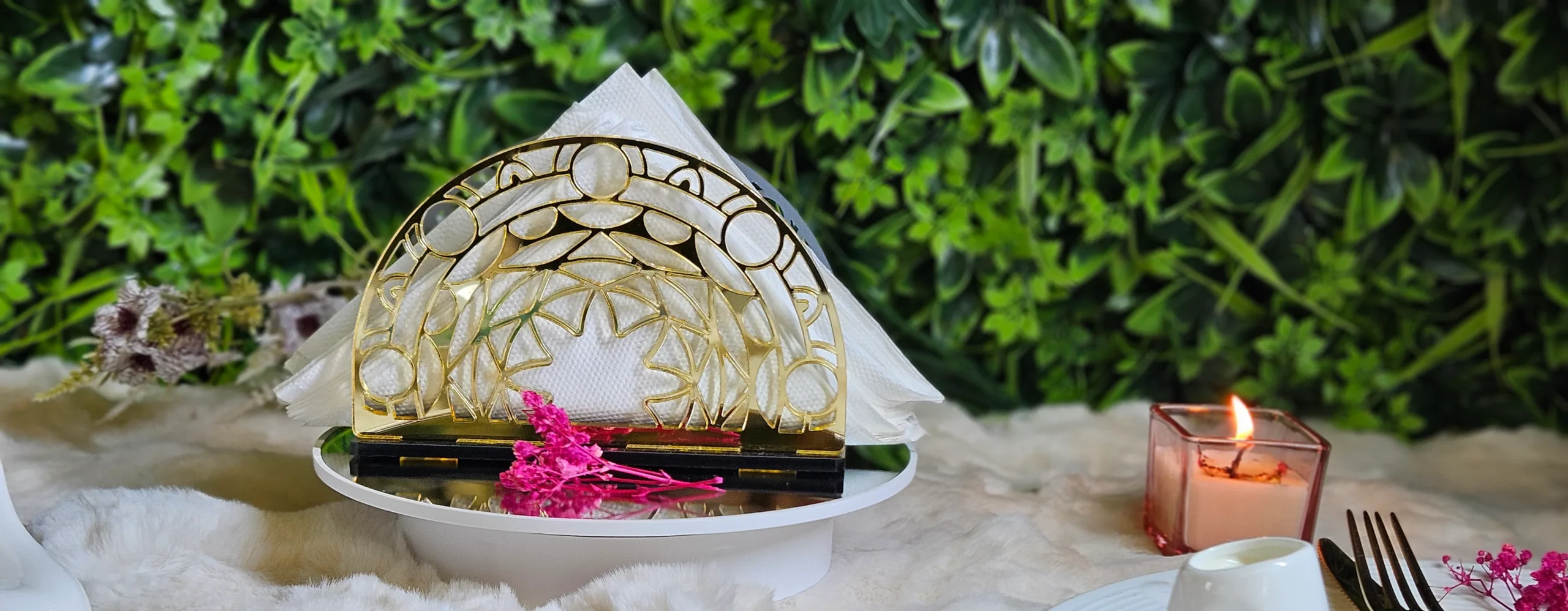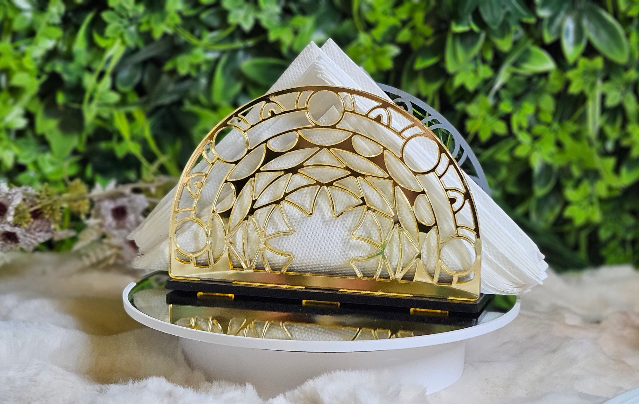 Elevate your table setting with our Mandala Nature Napkin Holder, featuring a refined laser-cut design that blends Modern elegance with natural inspiration. This beautiful piece is handcrafted using mirror gold acrylic and a sturdy gloss black base, making it a standout addition for home decor, events, or cafes.