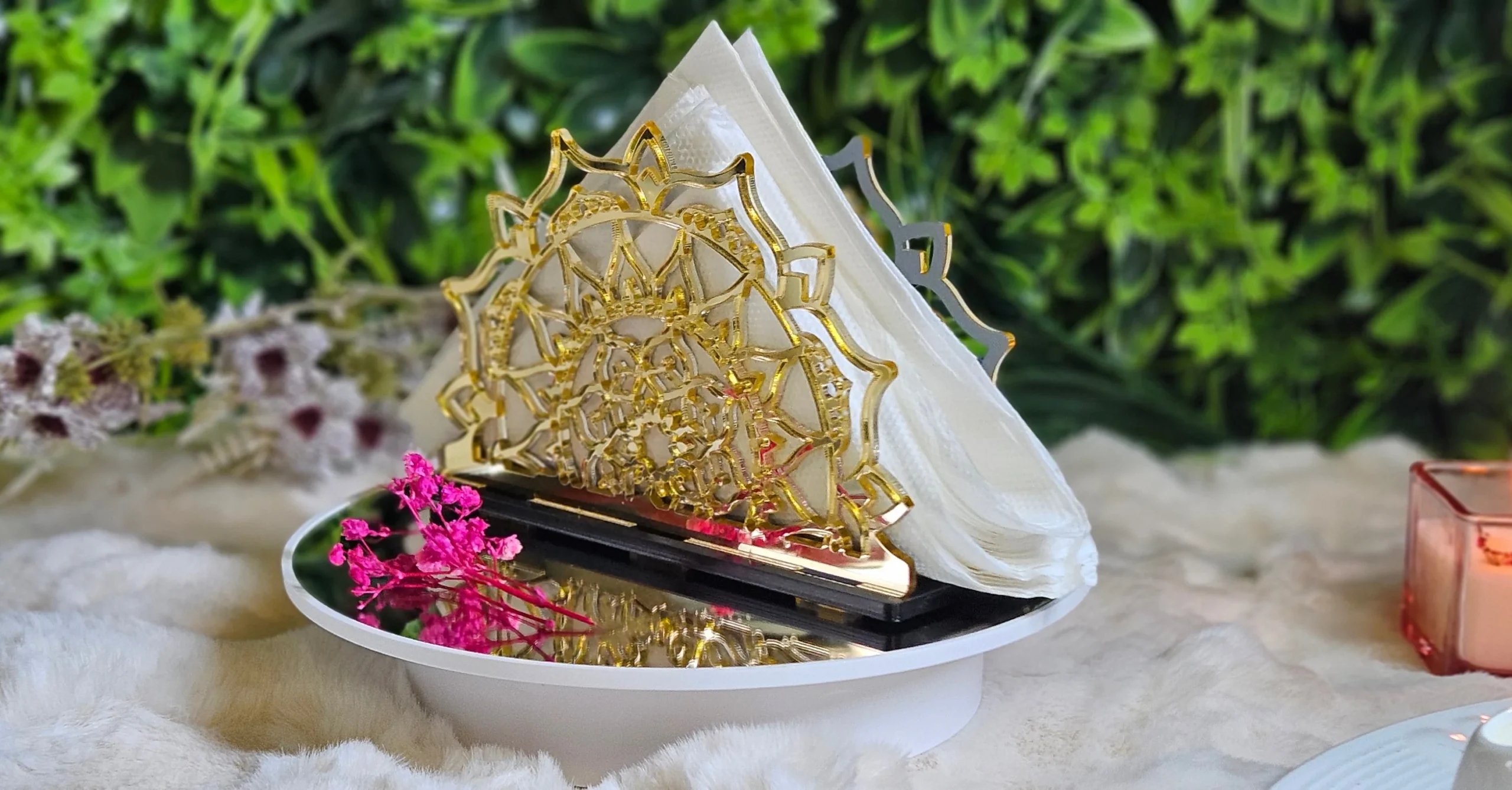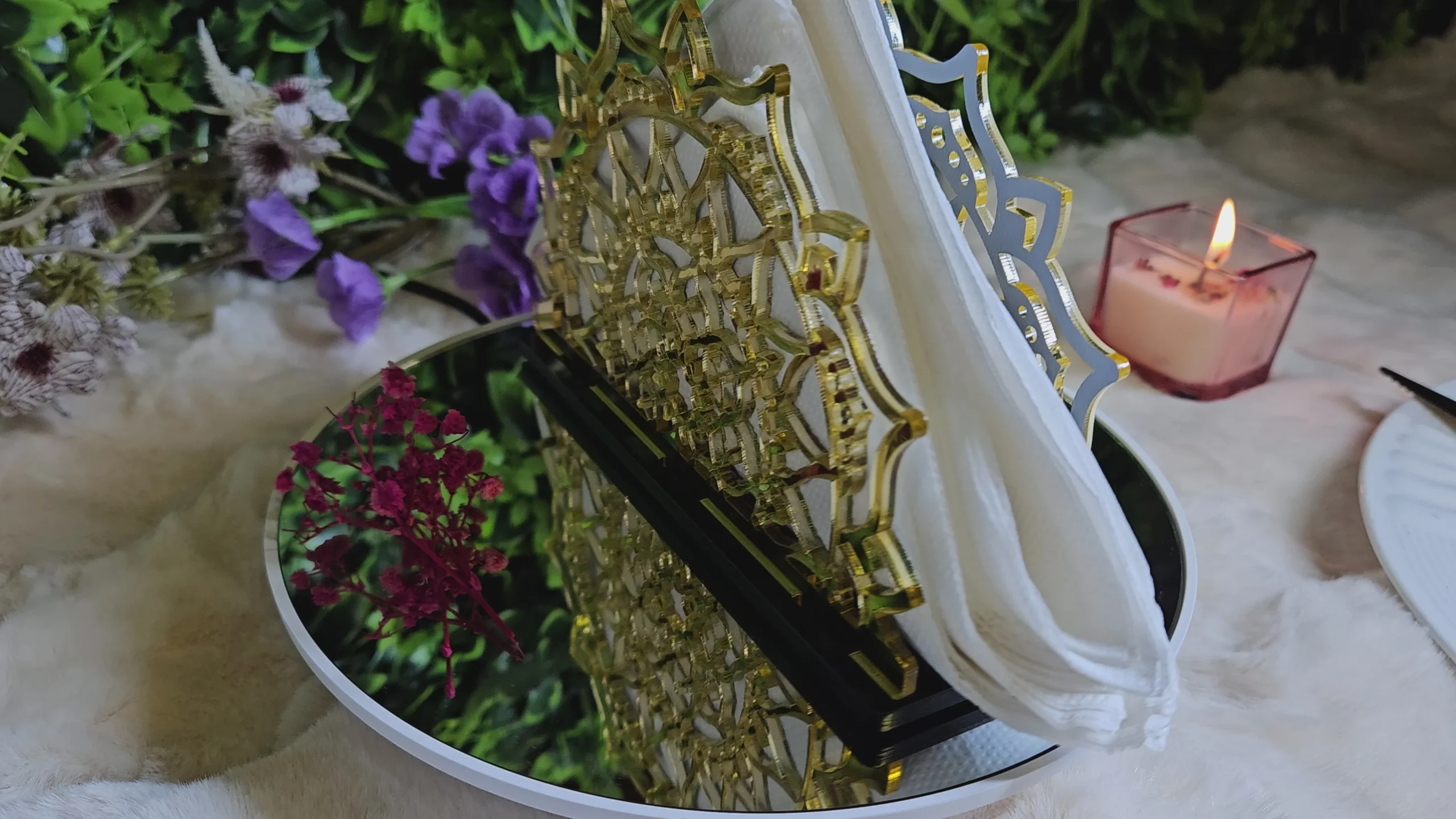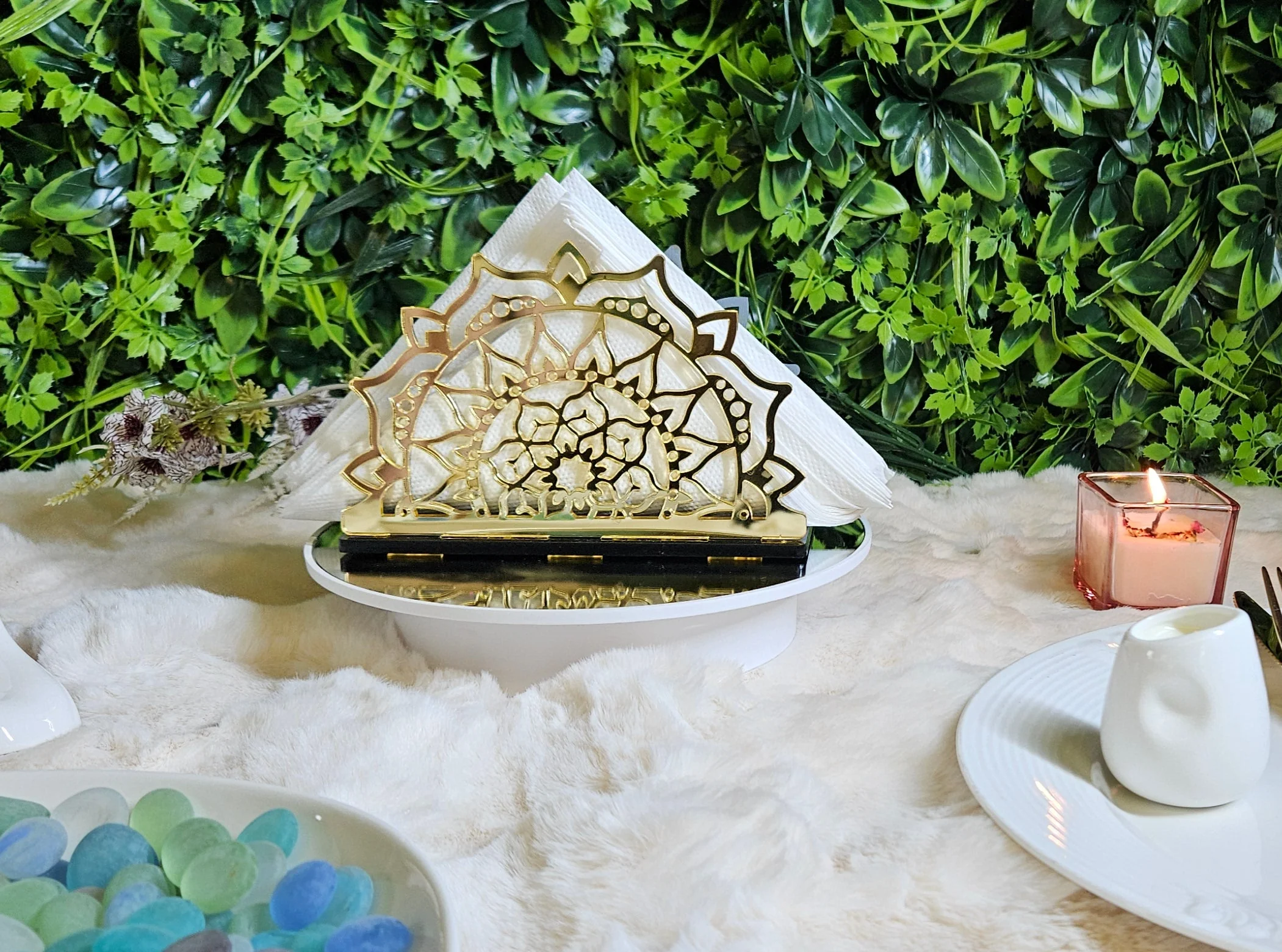Bring elegance to your table with our Mandala Piece Acrylic Napkin Holder — a perfect blend of function and modern design. This handcrafted piece features a delicately laser-cut mandala pattern in 3mm mirror gold acrylic, mounted on a 4.5mm gloss black base for durability and contrast.