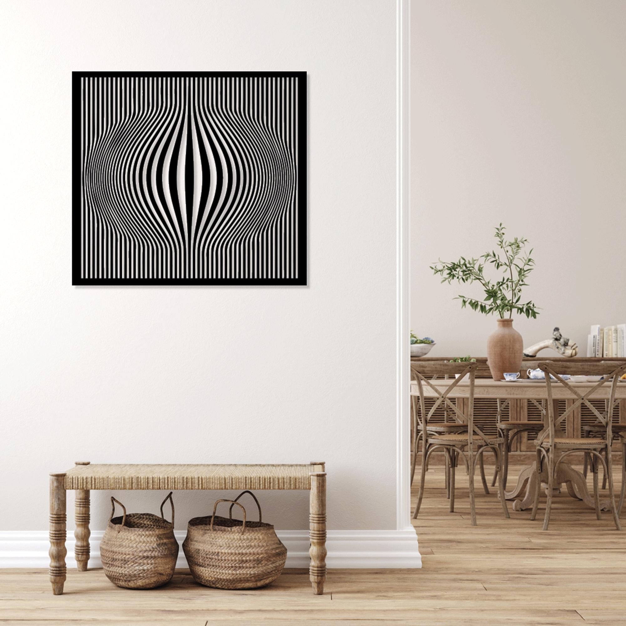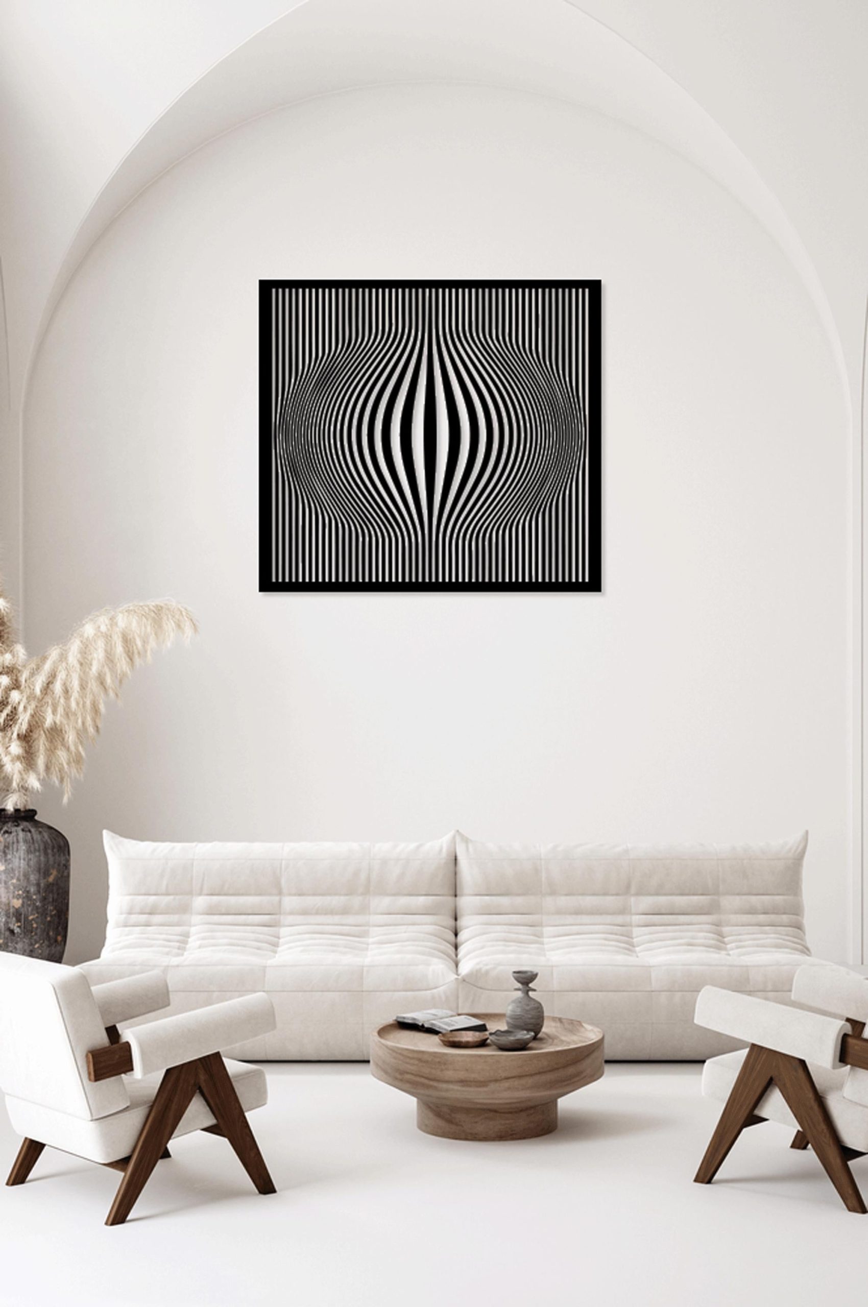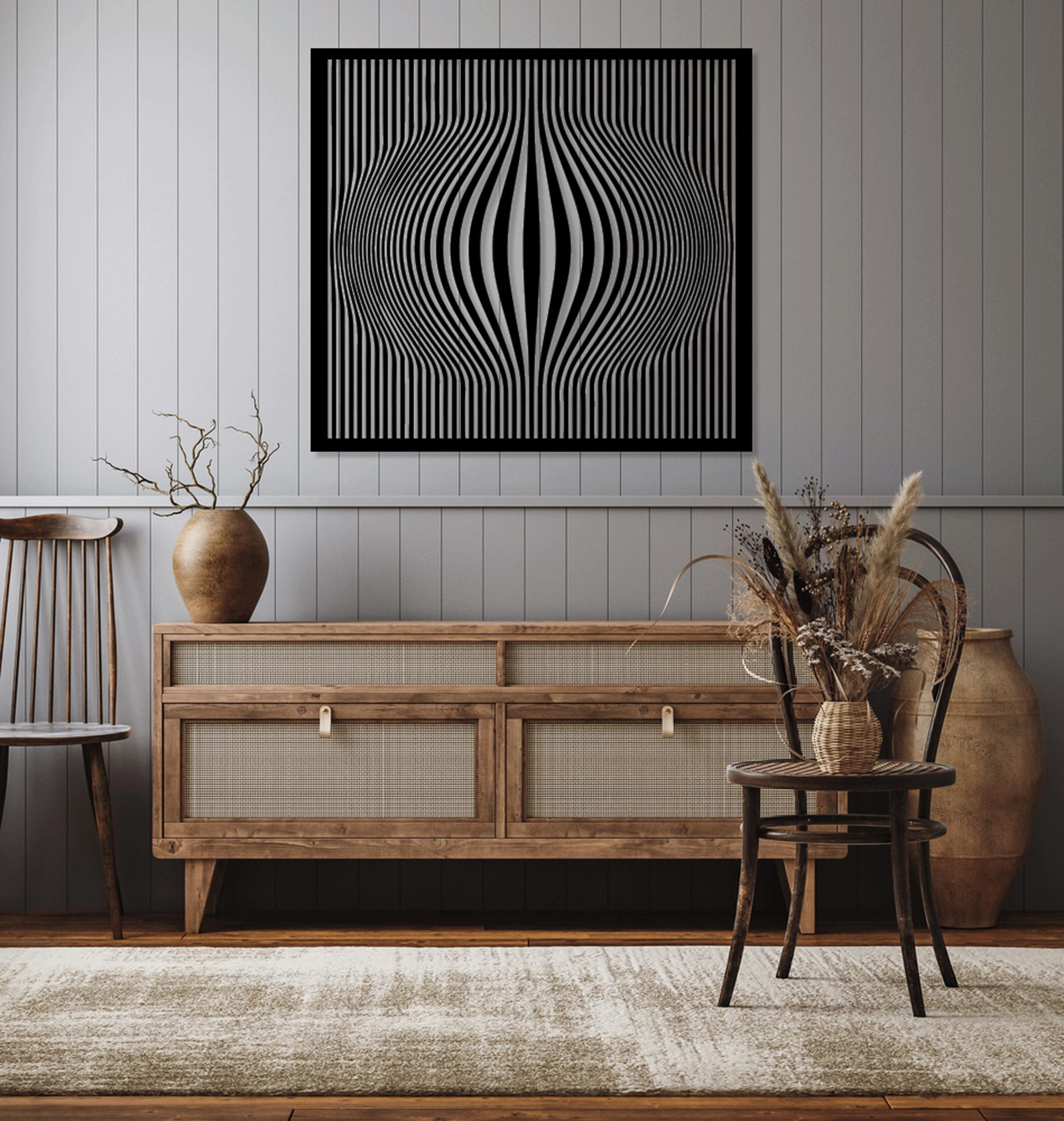 Design: Intricate vertical line pattern that bulges inward to produce a 3D optical illusion, framed within a clean rectangular border