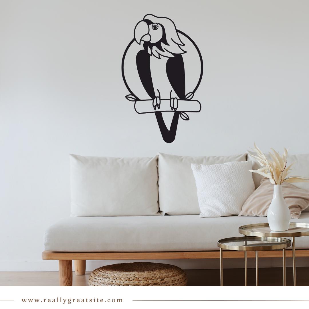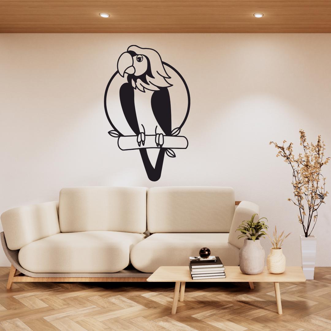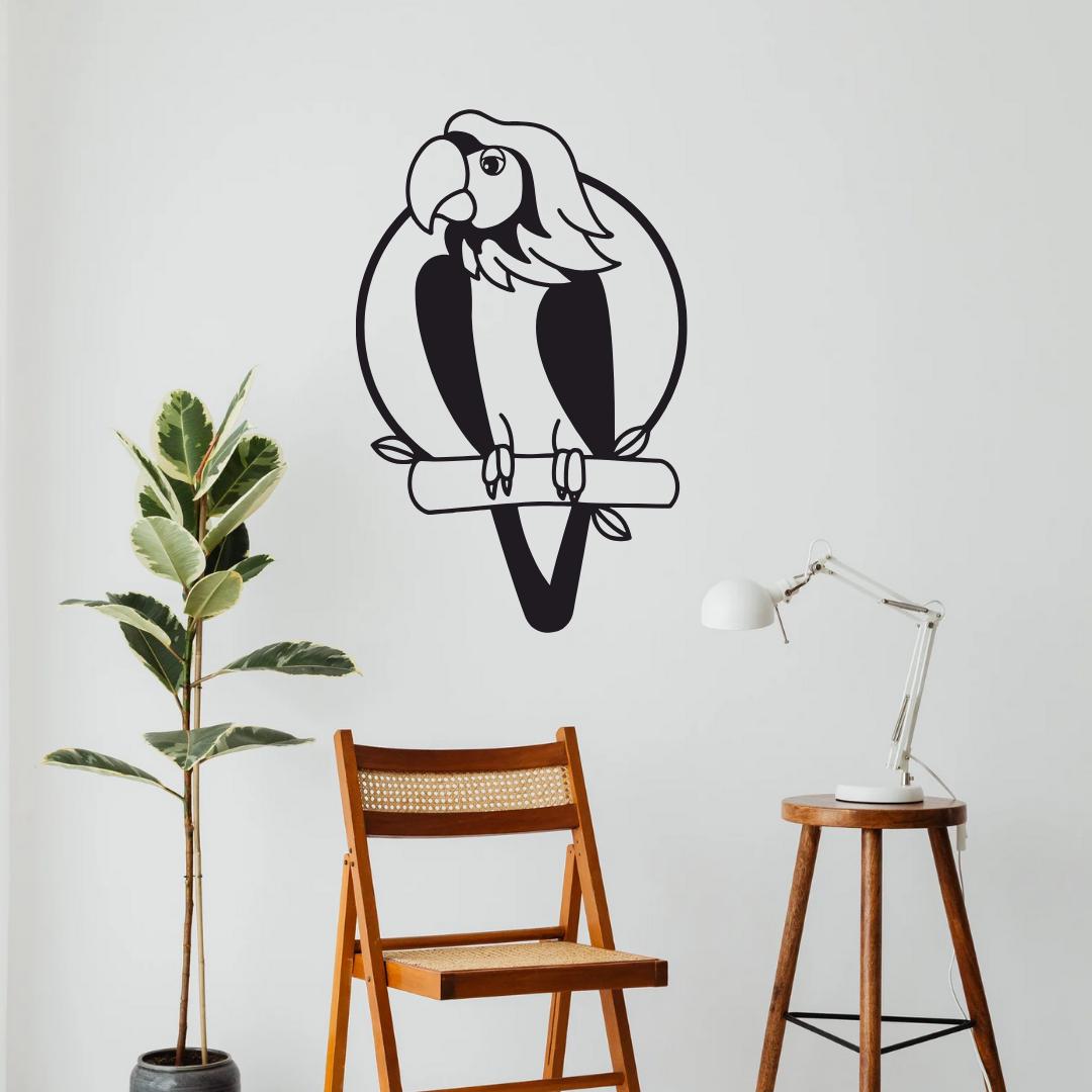 Design: Detailed parrot silhouette perched within a clean circular outline for a striking tropical accent