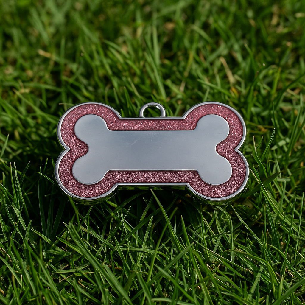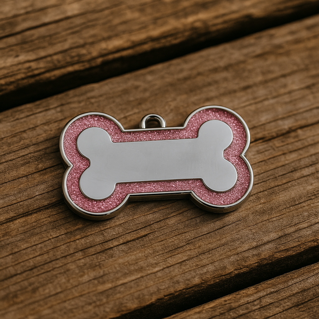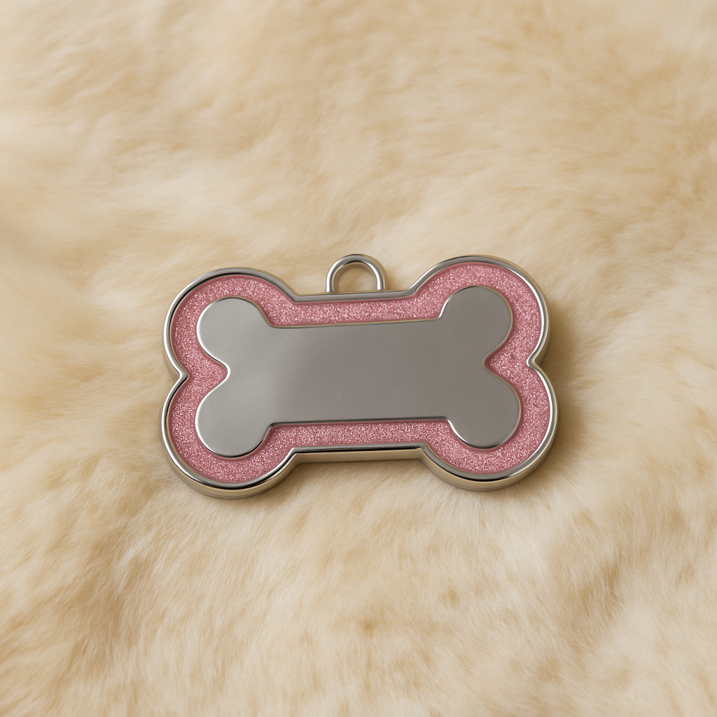 Add a sparkle of charm and security to your pet’s collar with this custom pink glitter bone-shaped ID tag. Crafted from durable, lightweight metal, it features a shimmering pink glitter border that combines cuteness with practicality.