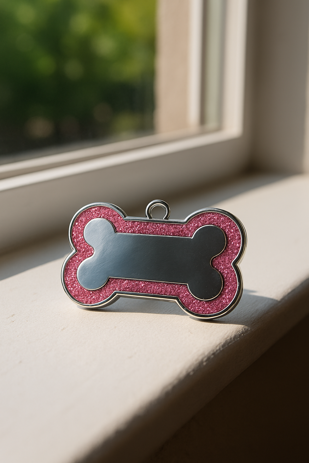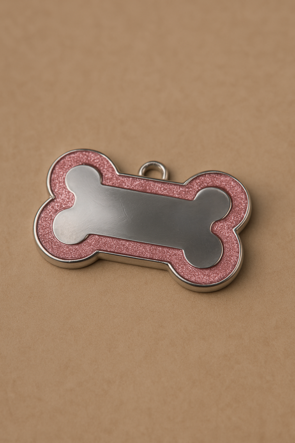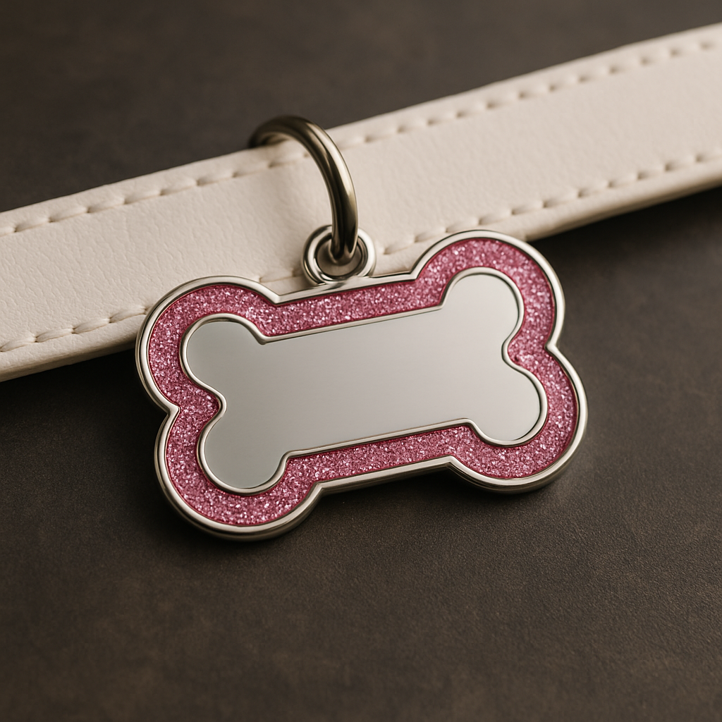 Add a sparkle of charm and security to your pet’s collar with this custom pink glitter bone-shaped ID tag. Crafted from durable, lightweight metal, it features a shimmering pink glitter border that combines cuteness with practicality.