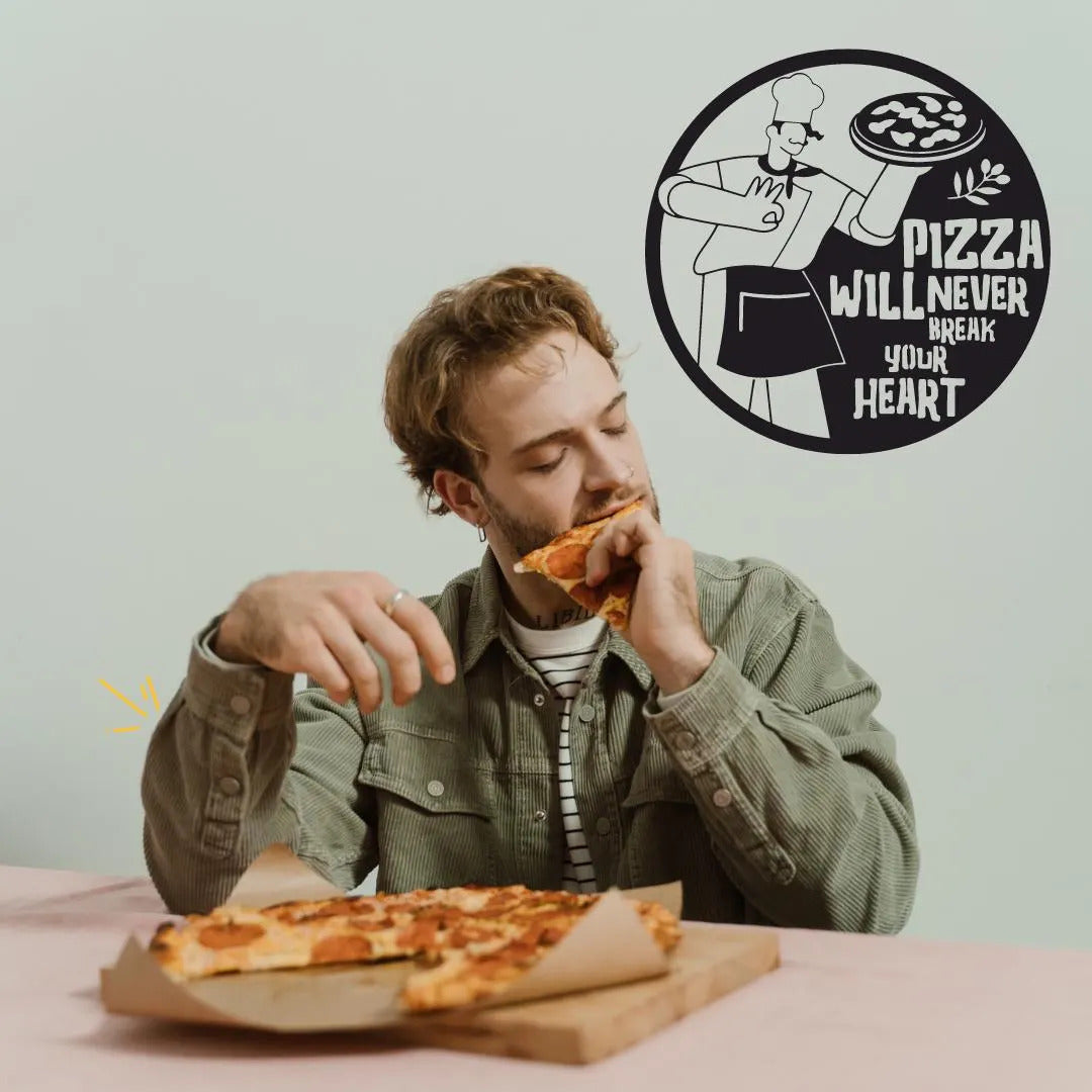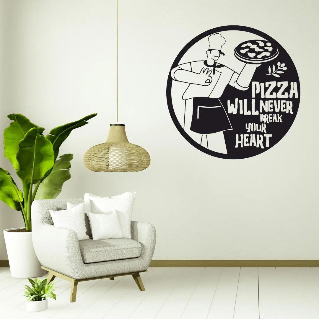 Design: Circular sign with a smiling pizza chef holding a pie and the text “Pizza Will Never Break Your Heart,” framed within a clean circle outline