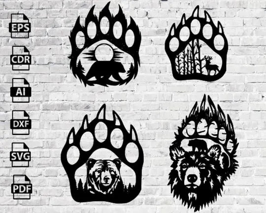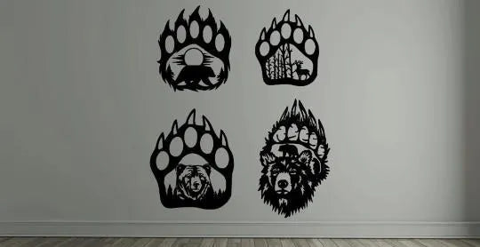Design: Four distinct bear paw silhouettes featuring detailed forest, mountain, and bear imagery within each paw outline for a cohesive, “rustic bear décor” ensemble