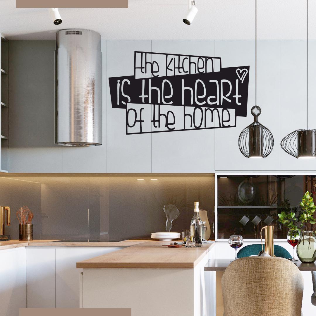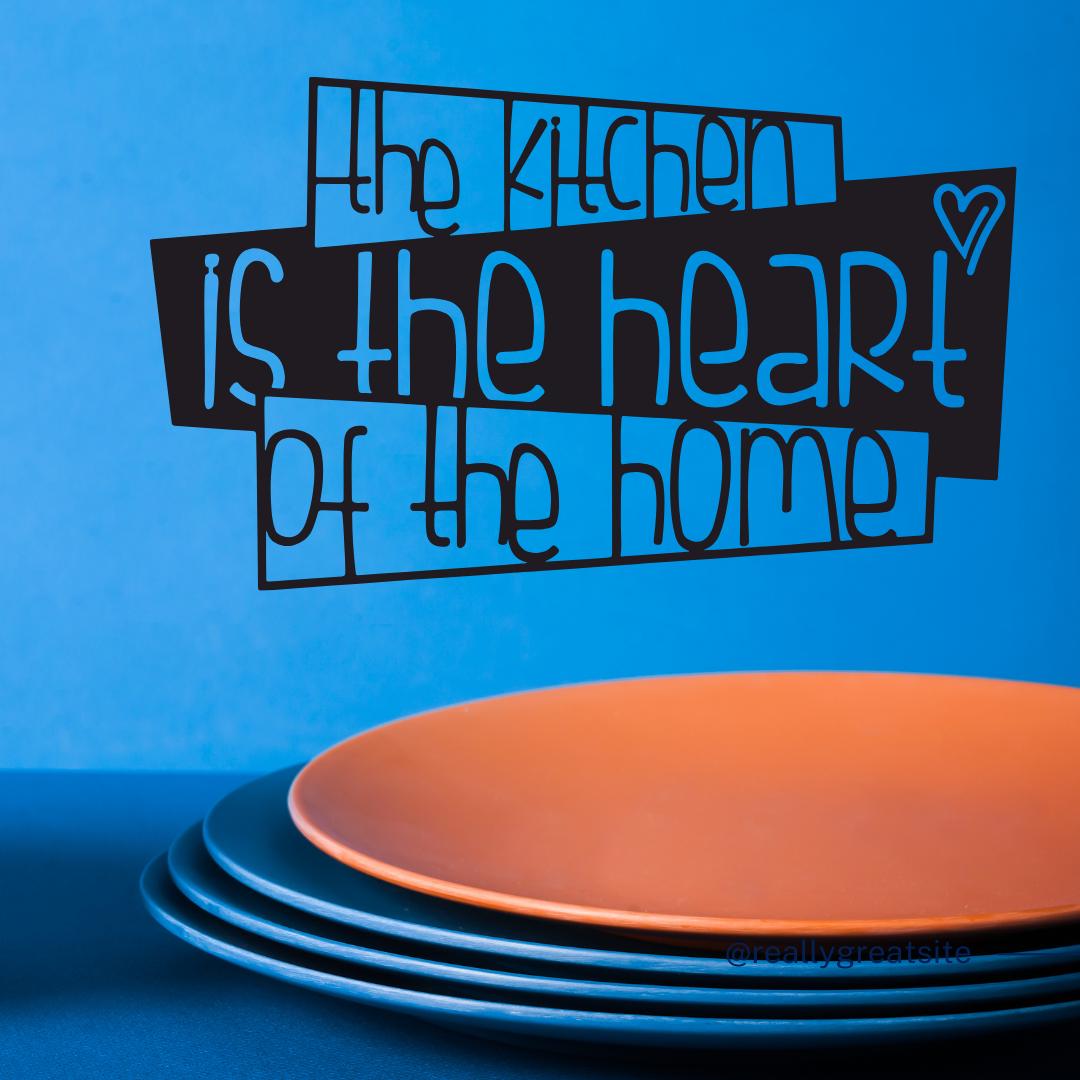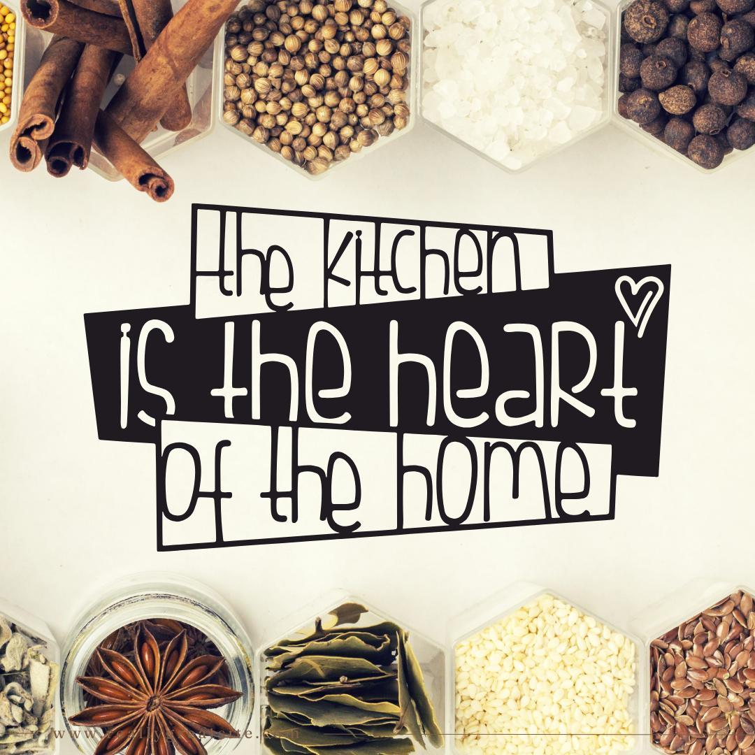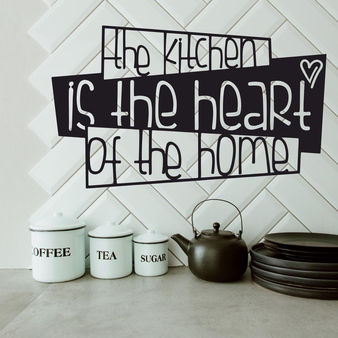 Design: Contemporary layered text with “The Kitchen” atop “Is the Heart” atop “Of the Home,” accented by a whimsical heart motif